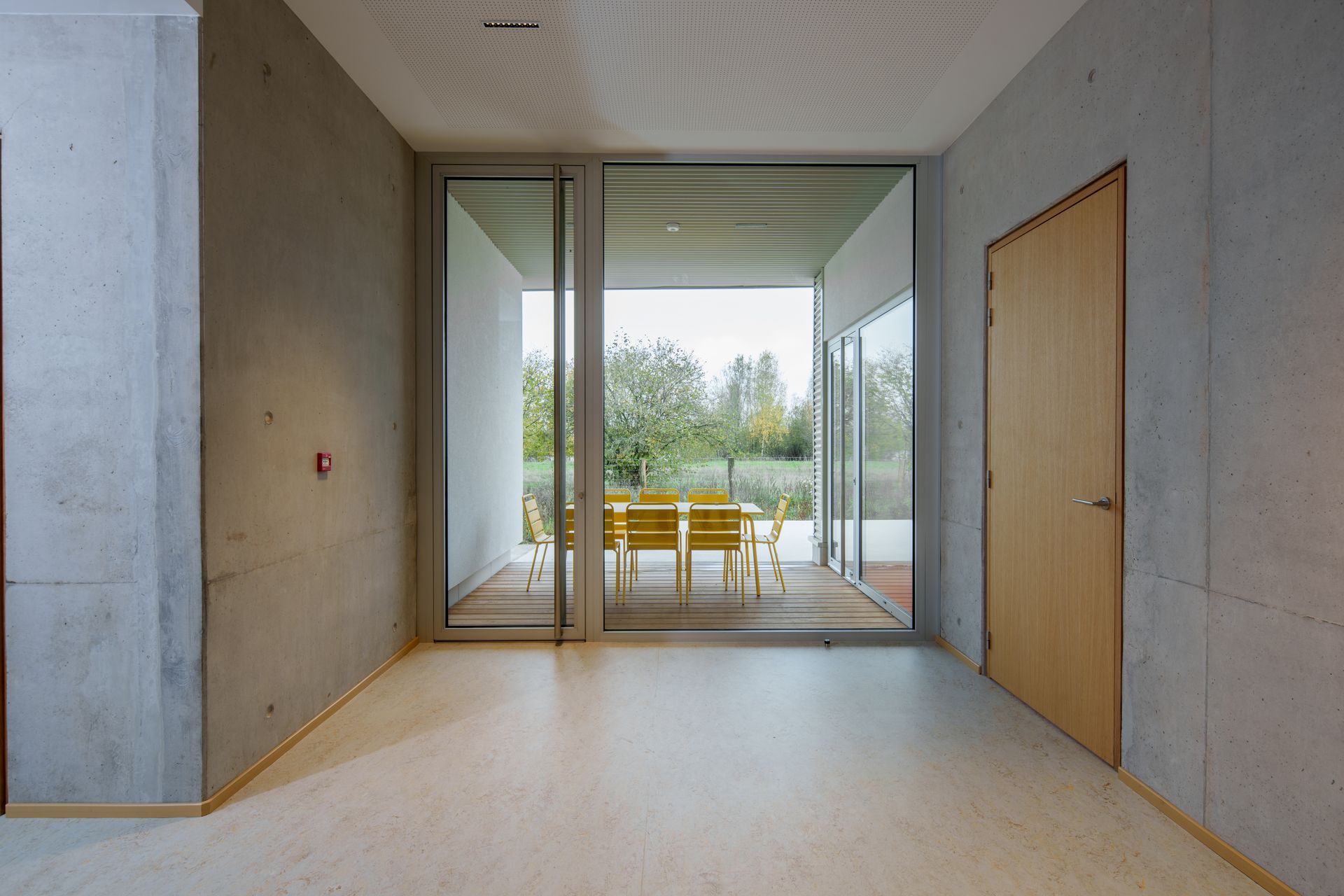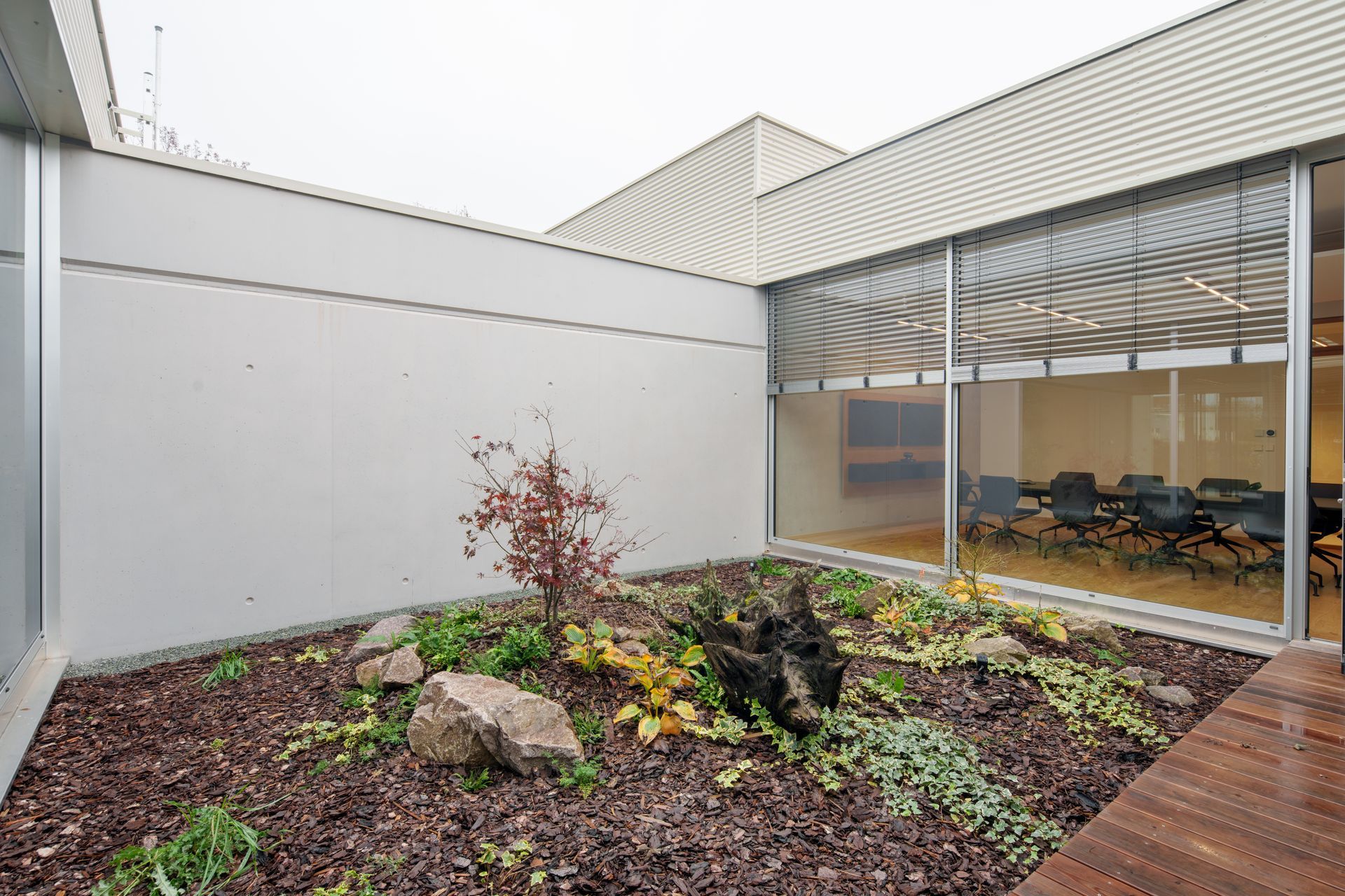 Les différentes fonctions du bâtiment - accueillir, travailler, archiver - s’organisent autour du patio. Cet aménagement d’une circulation centrale périphérique lumineuse permet de distribuer les différents locaux.