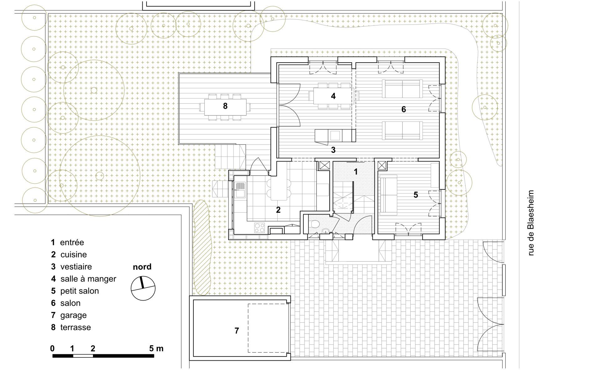 Cette famille avec deux enfants a acquis une maison des années 30 avec un terrain de 5 ares environ dans les environs de Strasbourg. Après quelques années passées, le rez-de-chaussée de 75 m² pose plusieurs problèmes : la cuisine est trop grande, le salon est exigu, les pièces de vie sont coupées du jardin. L’espace véranda n’est pas exploité et il manque un vestiaire à côté de l’entrée. Enfin, les clients souhaitent recevoir en grand nombre pour des fêtes de famille.