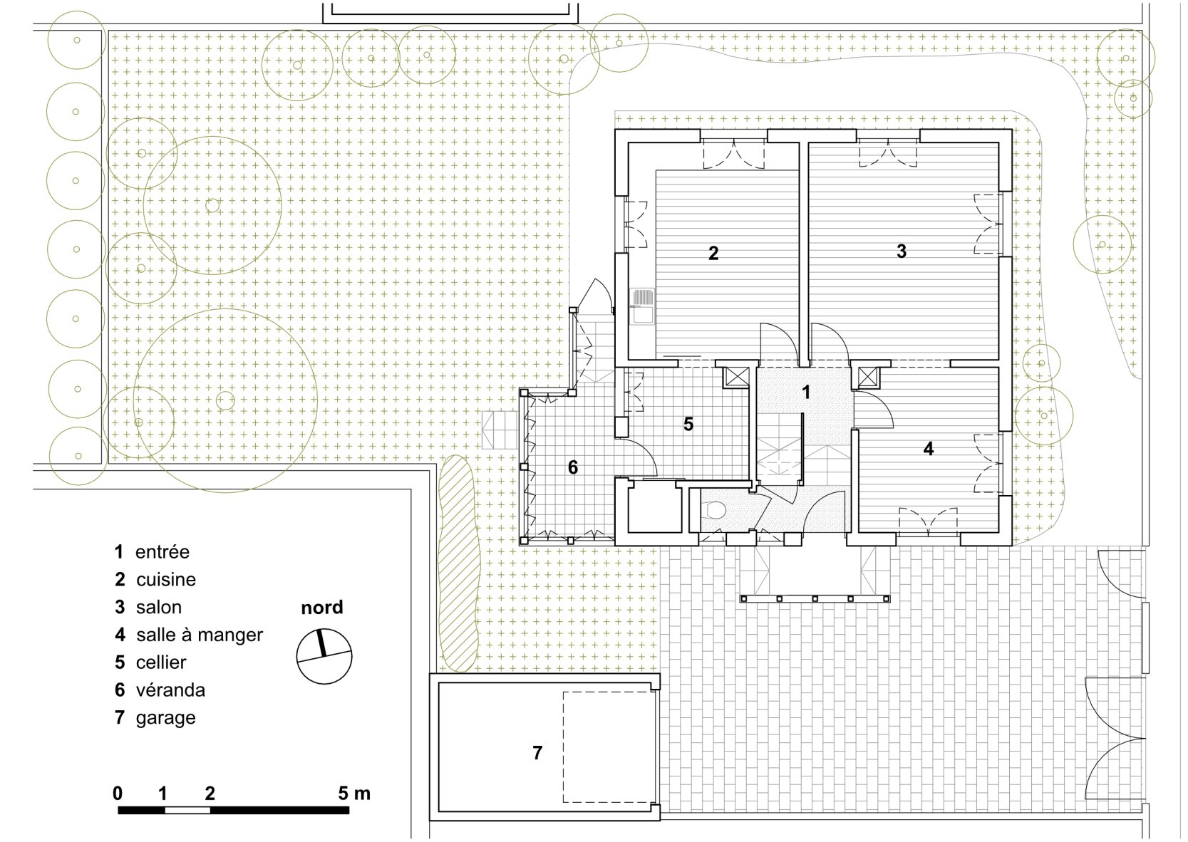 La cuisine prend place dans le volume de la véranda : les règles du PLU empêche d’agrandir ce volume qui est démoli et reconstruit à l’identique. Les plans de travail et les rangements s’organisent autour d’une table pour les repas du quotidien. Une large baie de type verrière ouvre sur le jardin, elle est doublée d’une porte-fenêtre menant à la terrasse. La précédente cuisine laisse place à un grand séjour traversant, orienté d'Est en Ouest, et ouvert sur la terrasse. Le petit salon est conservé et aménagé pour la projection de films.